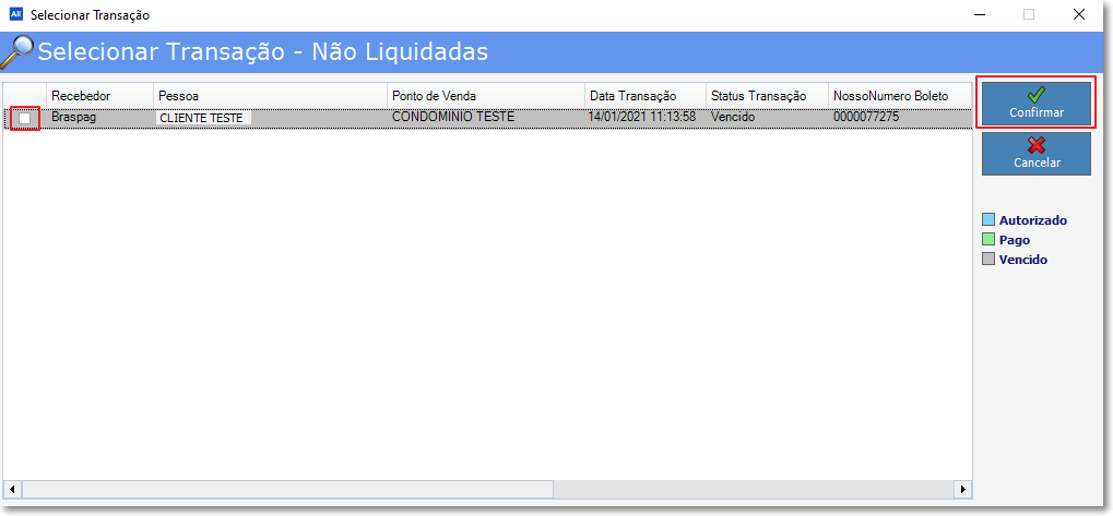 Clique no quadradinho para escolher o boleto e em seguida clique em "Confirmar".