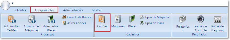 Menu disponível em Equipamentos > Cadastros > Cartões