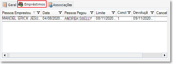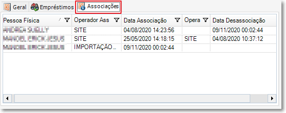 Nesta tela podemos ver todas as associações feitas com o cartão, Datas de associação e desassociação e para qual pessoa foi emprestado.