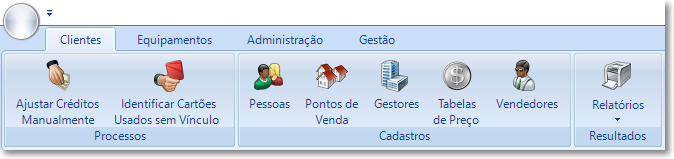 O Menu Principal é apresentado em Abas e dentro de cada Aba temos Grupos que nos direcionam para as telas do sistema.