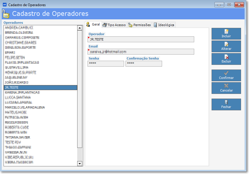 Nesta tela, podemos fazer o cadastro os Operadores.