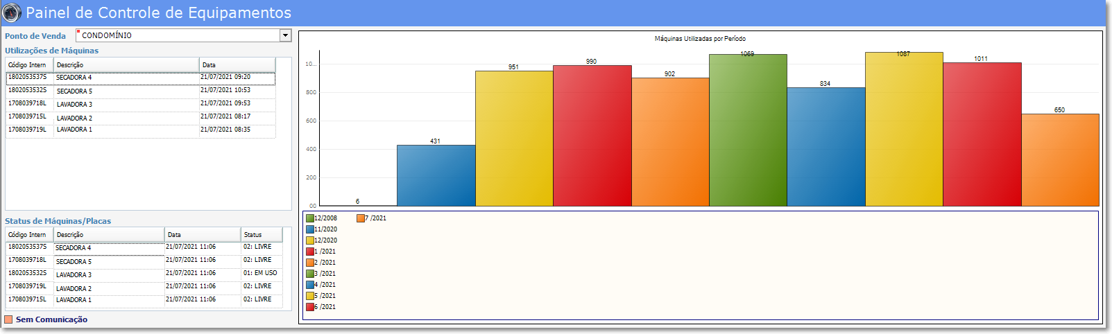 Nesta tela, podemos ter uma visão de todas as máquinas instaladas no Ponto de Vendas, com o gráfico de utilização de ciclos: