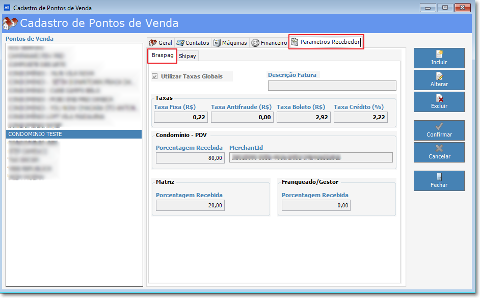 - Porcentagem recebida pelo Condomínio: É a porcentagem que o Ponto de Vendas recebe sobre o uso das maquinas cobrado pelo uso do espaço.