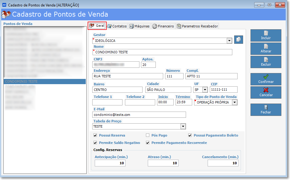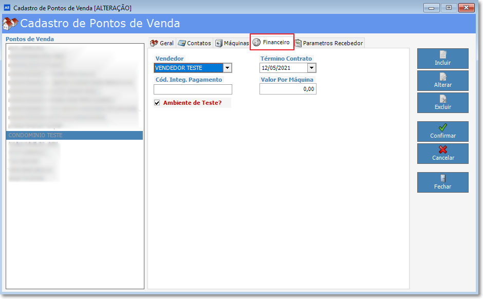 Neste cadastro encontramos as abas: Geral, Contatos, Máquinas, Financeiro e Parâmetro Recebedor.