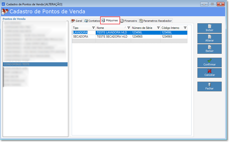 Nesta aba, são mostradas todas as máquinas previamente cadastradas para este Ponto de Vendas através do Administrar Máquinas.