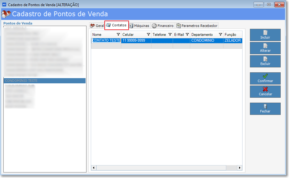 Nesta aba são incluidos os contatos de pessoas no Ponto de Venda. Podem ser zeladores, administradores, síndicos, etc.