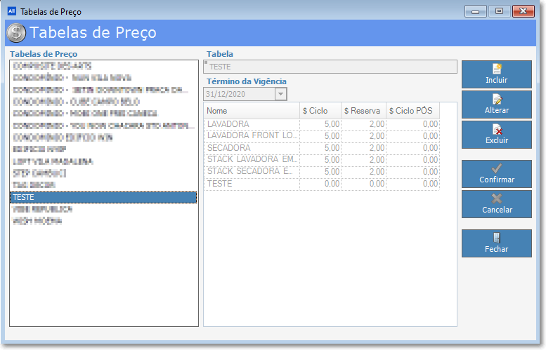 Nesta tela, podemos incluir, alterar, excluir ou consultar uma Tabela de Preço.