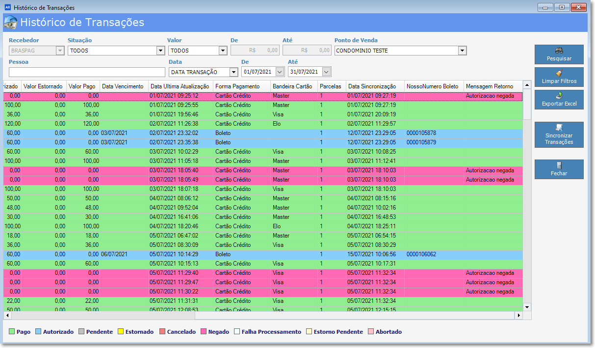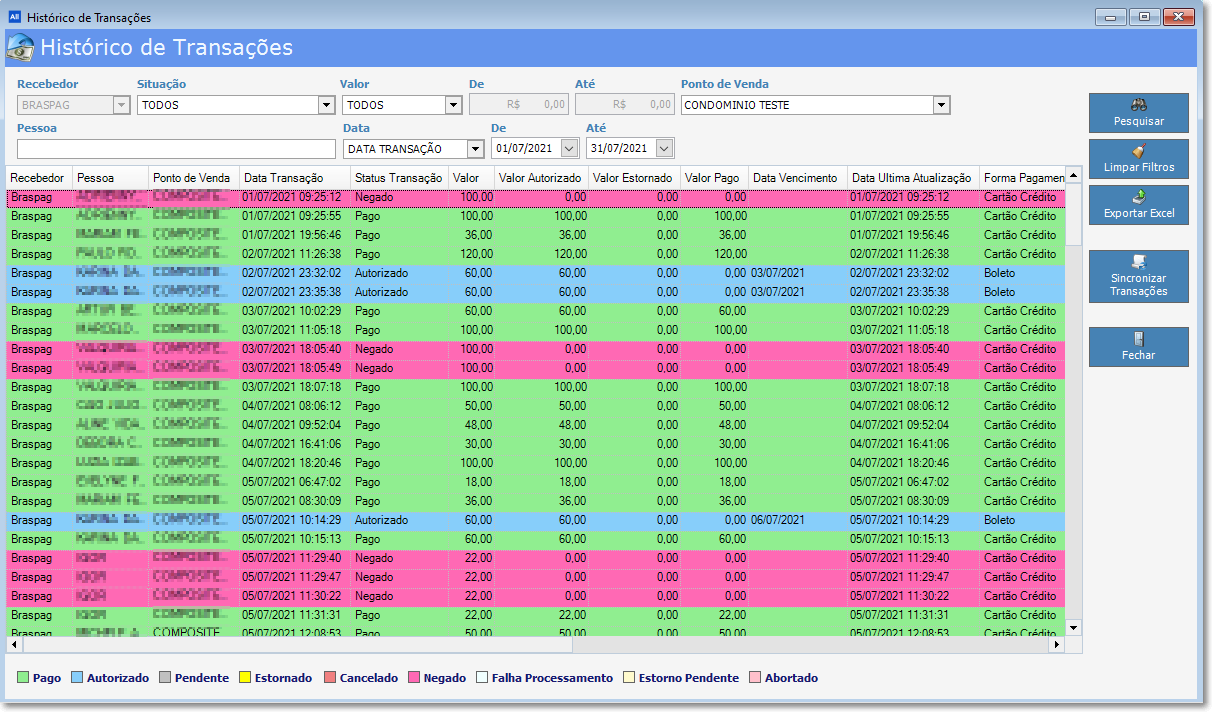 Nesta tela temos todo o histórico de transações, podendo escolher um ou todos os Pontos de Vendas, uma pessoa em específico, período de transação, etc.