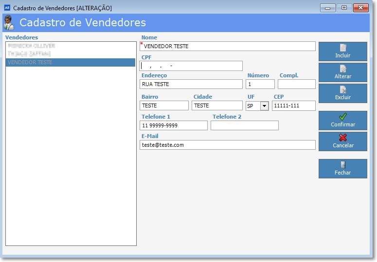 Nesta tela, podemos incluir, alterar, excluir ou consultar um Vendedor.
