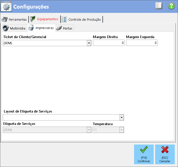 Ticket do Cliente/Gerencial, Margem Direita, Margem Esquerda, Layout de Etiqueta de Serviços, Etiqueta de Serviços e Temperatura.